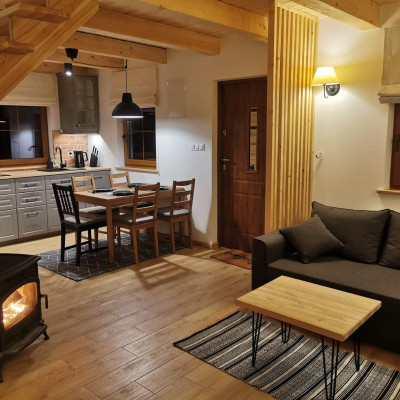 - w pełni wyposażona kuchnia (zmywarka, mikrofala, kuchenka indukcyjna, lodówka, czajnik elektryczny, garnki oraz naczynia i sztućce, stół i krzesła)