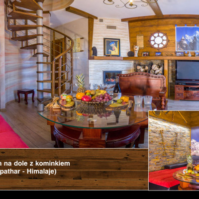 Do dyspozycji naszych gości oddajemy luksusowy apartament dwupoziomowy dla 1-8 osób. Parter to przestronny salonik z kominkiem, kuchnia z pełnym wyposażeniem, łazienka, a także taras z widokiem na Jarmutę, który uprzyjemni wypoczynek. Piętro, to dwa pokoje, w tym jeden z garderobą i antresolą, oraz przestronna łazienka z sauną, walory której docenicie państwo, nocując w naszym apartamencie zimą. Apartament posiada dostęp do Internetu (WiFi).