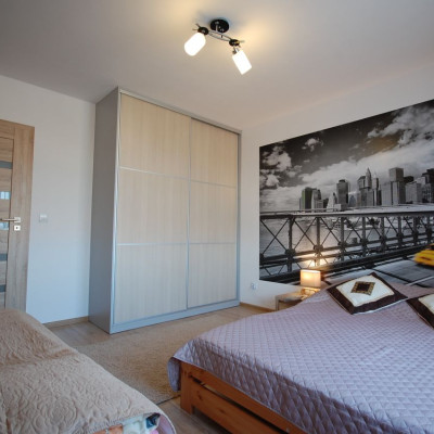 Sypialnia wyposażona jest w podwójne łoże małżeńskie i pojedyncze łóżko, szafkę nocną, lampkę oraz zabudowaną szafę .