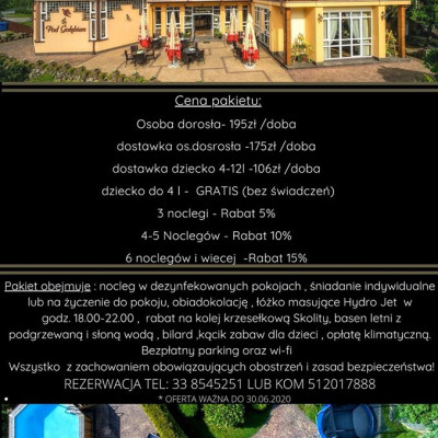 Nocleg w dezynfekowanych pokojach, śniadanie indywidualnie lub na życzenie gościa do pokoju, obiadokolację, łóżko masujące Hydro Jet w godz. 18.00 – 22.00, rabat na kolej krzesełkową Skolnity, basen letni z podgrzewaną i słoną wodą, bilard, kącik zabaw dla dzieci, opłatę klimatyczną. Bezpłatny parking oraz wi-fi.