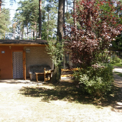 Domek składa się z dwóch pokoi, kuchni, łazienki z prysznicem oraz WC. Kuchnia jest w pełni wyposażona m.in. dużą lodówka, kuchenką gazową, czajnikiem elektrycznym, komplet naczyń. W każdym pokoju znajdują się po dwa duże dwuosobowe łóżka. W jednym z pokoi znajdą Państwo TV z tunerem telewizji naziemnej, natomiast w drugim pokoju wieżę hi-fi. Dodatkowo do domku przynależy taras, na którym znajduję się kanapa, aby móc odpocząć i w pełni cieszyć się urokiem lasu oraz odetchnąć świeżym powietrzem. Obok domku znajduję się również stolik z ławeczkami, przy którym można usiąść i rozpalić grilla (Grill również znajduję się na wyposażeniu domku). Plaża znajduję się ok 100 m od domku. Domek położony jest na terenie ośrodka wypoczynkowego Arizona w Rusi Małej k/Ostródy. Teren jest zalesiony położony nad j. Pauzeńskim oraz ogrodzony i chroniony przez 24h. Centrum Ostródy oddalone jest od ośrodka o ok 7km