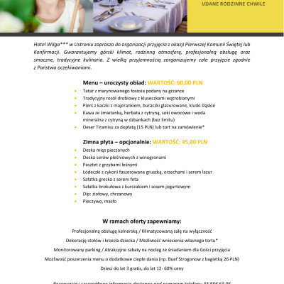 Hotel Wilga*** w Ustroniu zaprasza do organizacji przyjęcia z okazji Pierwszej Komunii Świętej lub Konfirmacji. Gwarantujemy górski klimat, rodzinną atmosferę, profesjonalną obsługę oraz smaczne, tradycyjne kulinaria. Z wielką przyjemnością zorganizujemy całe przyjęcie zgodnie z Państwa oczekiwaniami.