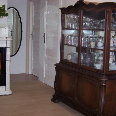 Salon- dwie kanapy, okrągły stół, który rozkłada się do wielkości 230 cm, krzesła, telewizor, wieża z odtwarzaczem CD. Biały, kaflowy kominek w chłodne wieczory stworzy niepowtarzalny nastrój.